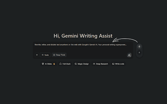 مساعد الكتابة جمنائي هو ملحق كروم يستفيد من قوة جمنائي AI لتحسين كفاءة الكتابة ووضوحها. مصمم للمستخدمين عبر مختلف المهن، هذه الأداة تسمح بتحسين النص الفوري من خلال اختصارات بسيطة. يمكن للمستخدمين تحديد النص وإعادة كتابته من أجل تحسين الوضوح، والنغمة، والأسلوب، مما يجعلها مثالية للتغلب على عائق الكتابة أو تنقيح الرسائل. بالإضافة إلى ذلك، تقدم ميزات لتكييف نغمة الكتابة، والتحكم في طول النص، وتوفر وظيفة قوية لتحويل الصوت إلى نص للتدوين بدون استخدام اليدين.